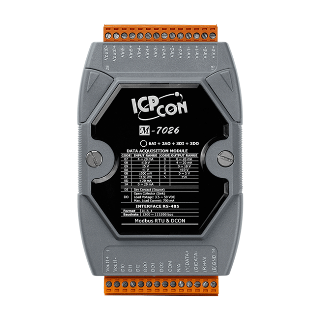 M-7026 是一個多功能模組,具有 6 個類比輸入通道、2 個類比輸出通道、3 個數位輸入通道、和 3 個數位輸出通道。所有類比輸入通道皆提供可編程的輸入範圍(±150 mV、±500 mV、±1 V、±5 V、±10 V、±20 mA 或 0 ~ + 20 mA),類比輸出為 12 位元,±5 V、±10 V、0 ~ +20 mA 或 +4 ~ +20 mA,所有數位輸出均可設置為報警輸出。每個類比輸入皆可設定單獨的範圍,並提供 240 Vrms 的過電壓保護,可用跳線選擇電壓或電流輸入/輸出。
