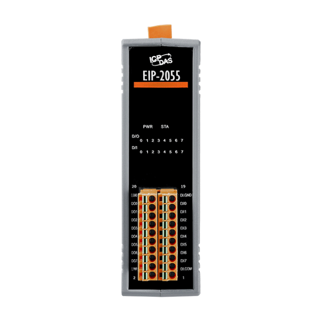 EIP-2055是一個8通道的數位輸入及8通道數位輸出模組。模組類型為EtherNet/IP的從端,使用者可以藉由觀察模組上的LED指示燈來確認連線狀態,及I/O狀態,泓格更是提供了免費的應用工具軟體來設定及測試EIP-2000模組。