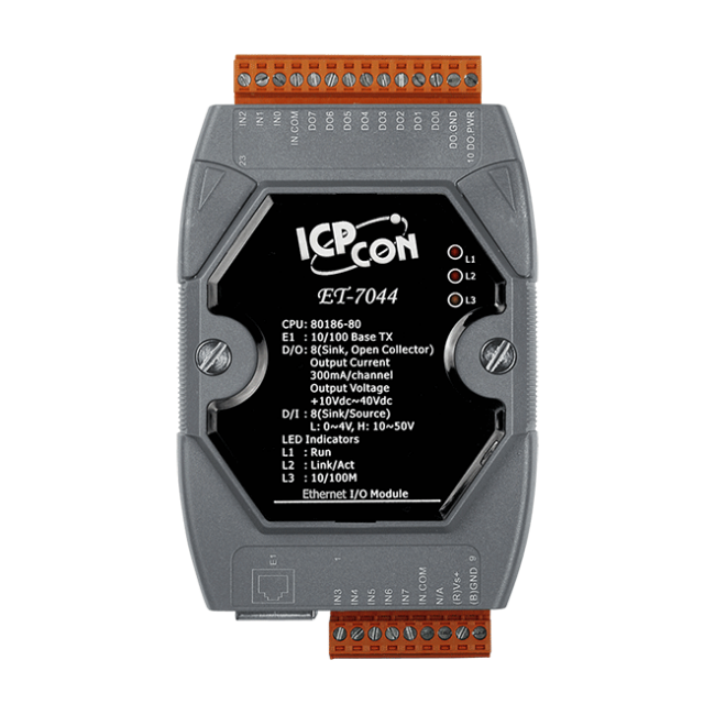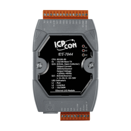 ET-7044 配有 8 個濕接點數位輸入通道 與 8 個 Sink-type 數位輸出通道。該模組具有 3750 VDC 瞬態過電壓保護的光隔離功能,但沒有通道間隔離。每個輸入通道都可用來當成一個 32-bit 的計數器,且每個輸出通道可驅動 300 mA 負載。用戶可編程數位輸出的上電值與安全值,讓模組更安全地應用在存有危險電壓的現場。